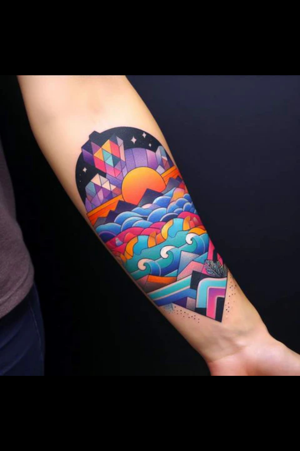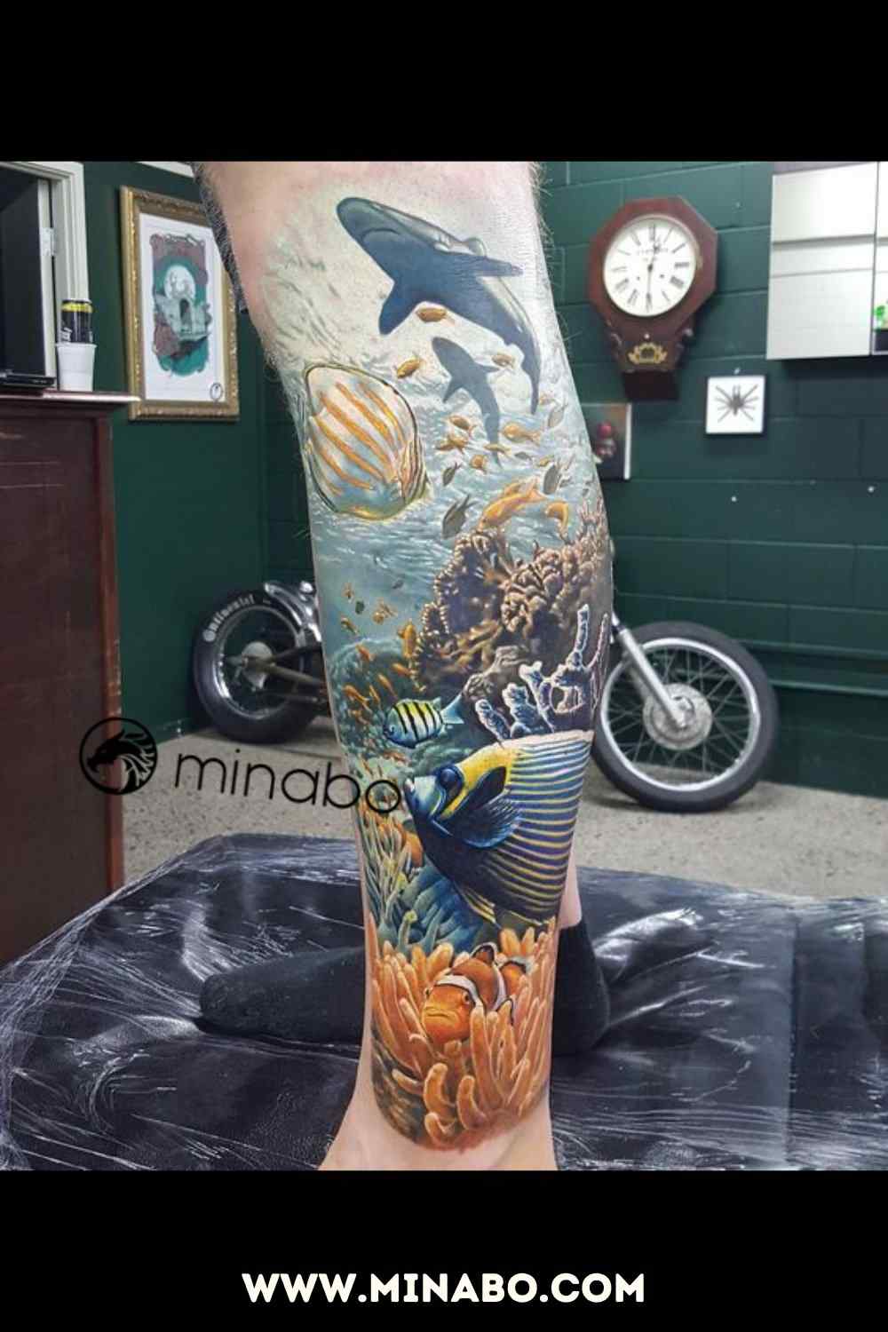 Un tatuaje de paisaje submarino es perfecto para quienes desean un diseño detallado y colorido que capture la belleza y el misterio de las profundidades marinas.