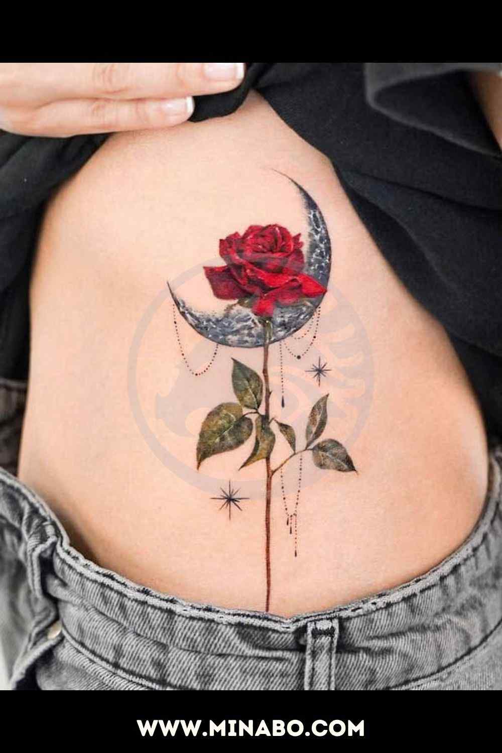 La cintura es una zona íntima que resalta la forma femenina de una manera natural, permitiendo que los tatuajes fluyan con las curvas del cuerpo.