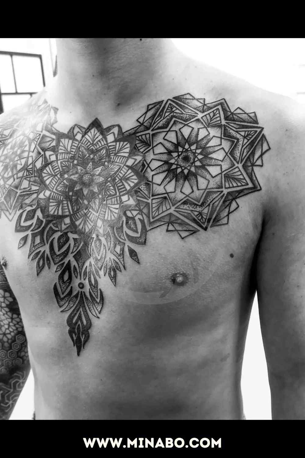 Los mandalas y los patrones geométricos son una opción popular para tatuajes en el pecho debido a su simetría y belleza.